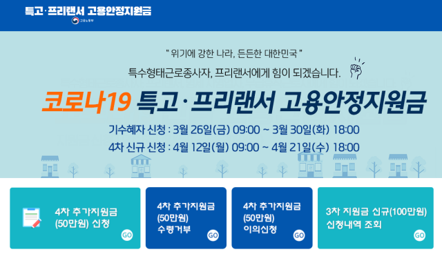 특수형태 근로자와 프래랜서 중 기존에 재난지원금을 지원받은 자는 50만 원, 신규 대상자는 100만 원을 받을 수 있습니다. 이분들은 소상공인과는 다르게 '특고·프리랜서 고용안정 지원금' 사이트에서 재난지원금을 신청할 수 있습니다.