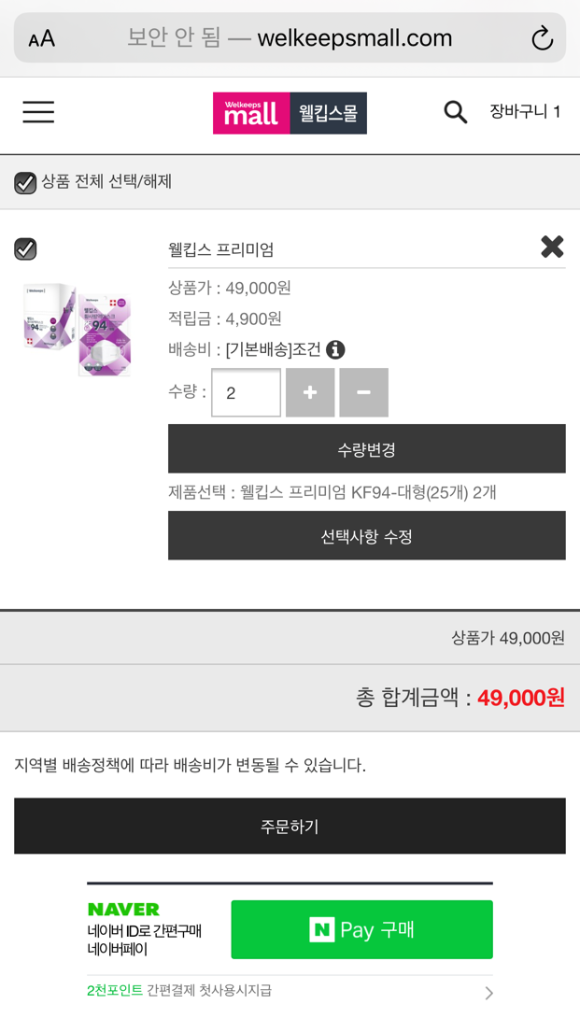 웰킵스에서 예전에는 시간을 정해서 마스크를 풀었더니 서버가 다운되서, 요즘에는 시간을 정해놓지 않고 게릴라 형식으로 마스크를 풉니다. 하루 종일 그 사이트에 들어가 있는 게 아닌 이상 운이 좋아야 걸리는 거죠.