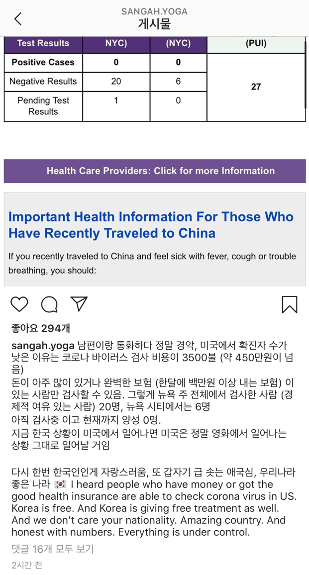 Instagram의 Sangah Amita Park *United yoga님: “남편이랑 통화하다 정말 경악, 미국에서 확진자 수가 낮은 이유는 코로나 바이러스 검사 비용이 3500불 (약 450만원이 넘음) 돈이 아주 많이 있
