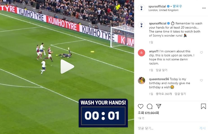 어제 토트넘 홋스퍼 인스타그램에 손 씻기 홍보 동영상이 올라왔습니다.