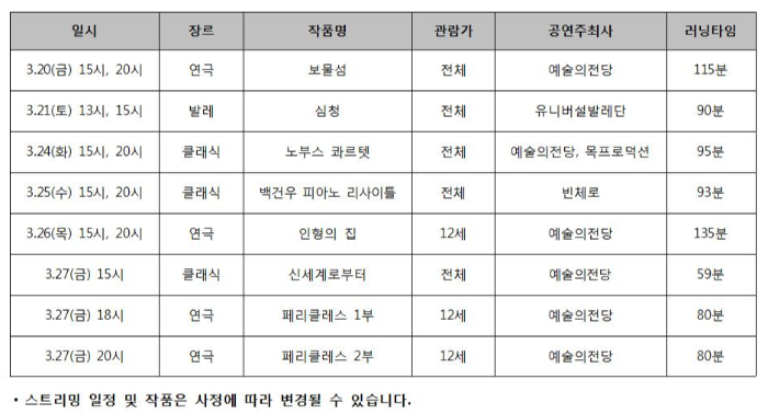 예술의 전당 유튜브 채널 '서울 아트 센터(Seoul Arts Center)'를 통해 송출될 예정입니다.