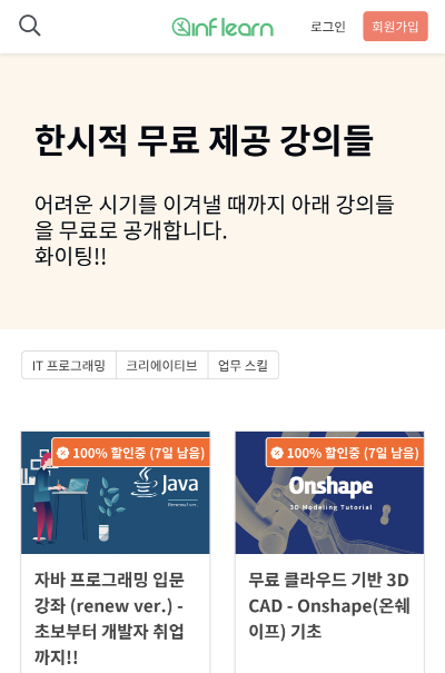 인프런 이라는 온라인 강의 업체에서 코로나 때문에 집에 머물러야 하는 사람들을 위해 한시적으로 일부 온라인 강의를 무료로 제공하고 있습니다.