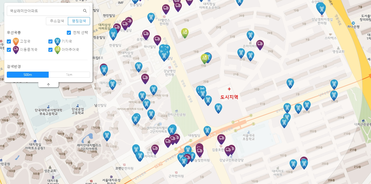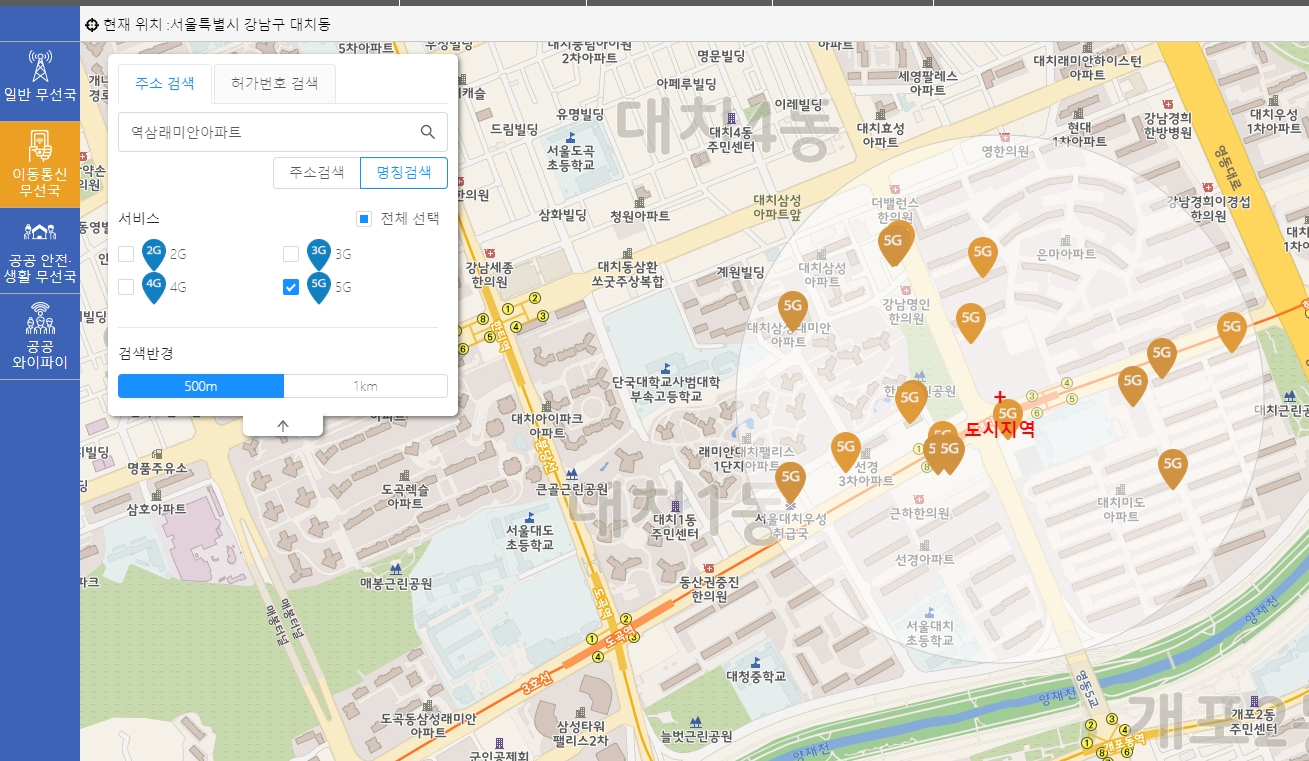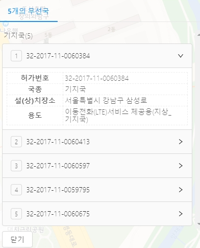 원하는 주소를 넣고 검색하면 아래와 같이 상세하게 기지국 위치가 뜹니다.