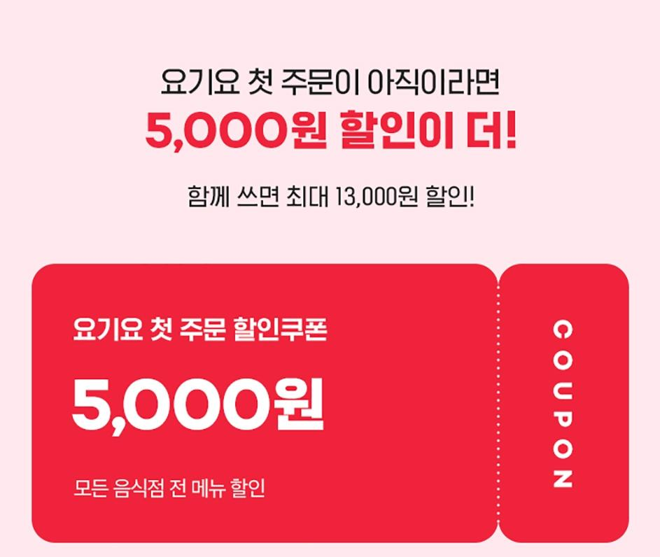 여기에 하나 더 추가해서, 요기요 첫 주문이라면 신규회원 5,000원 할인이 추가되서 총 13,000원 할인을 받네요.