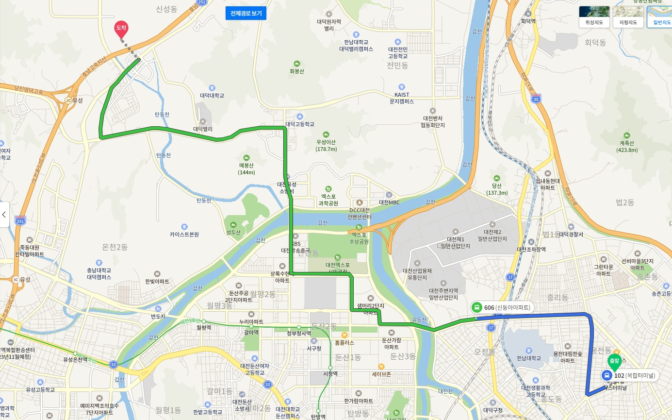 대전복합버스터미널 -> 대전국군병원 : 대중교통으로 약 1시간 걸림