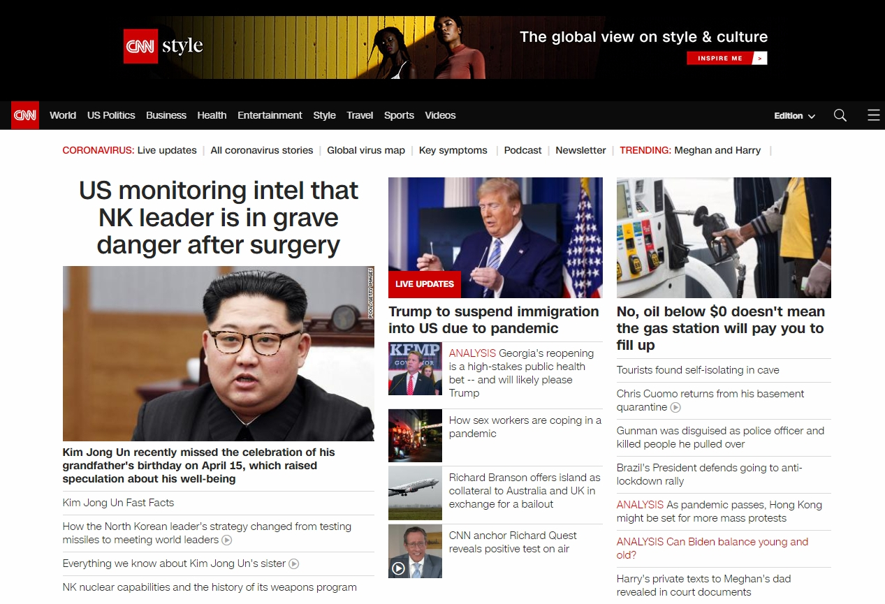 오늘 아침 깜짝 놀랄 만한 소식이 있었습니다. 북한의 김정은이 수술 후 중태에 빠졌다는 CNN의 속보였는데요. 현재 CNN 메인 화면을 보면 왼쪽 부분에 김정은에 관련된 뉴스가 자리를 잡고 있는 걸 보실 수 있습니다.