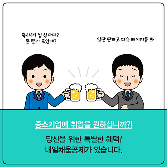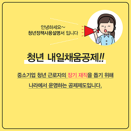 청년 내일채움공제란 청년들에게는 장기근속과 목돈마련의 기회를 주고 기업에게는 우수인재 확보의 기회를 주기 위해 고용노동부와 중소벤처기업부가 공동으로 운영하는 사업입니다.