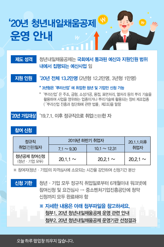 2020년에는 2년형 12.2만 명, 3년형 1만 명을 지원할 예정이며, 정규직 채용일로부터 6개월 이내 청약신청을 완료해야 하므로 2020년 가입대상은 2019년 7월 1일 이후 정규직으로 취업하거나 취업 전환한 자에 해당하니 잘 살펴보시기 바랍니다.