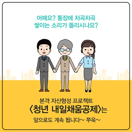 청년의 경우, 청년 내일채움공제를 이용한다면 최소 2~3년 동안 같은 사업장에서 근무하면서 실질적 경력을 쌓을 수 있고, 만기 후 목돈 마련이 가능한 장점을 가지고 있습니다. 만기 후 마련한 목돈은 중소벤처기업부의 내일채움공제(3~5년)로 연장 가입 시 최대 8년의 장기적인 목돈마련이 가능하니 참고하기 바랍니다.