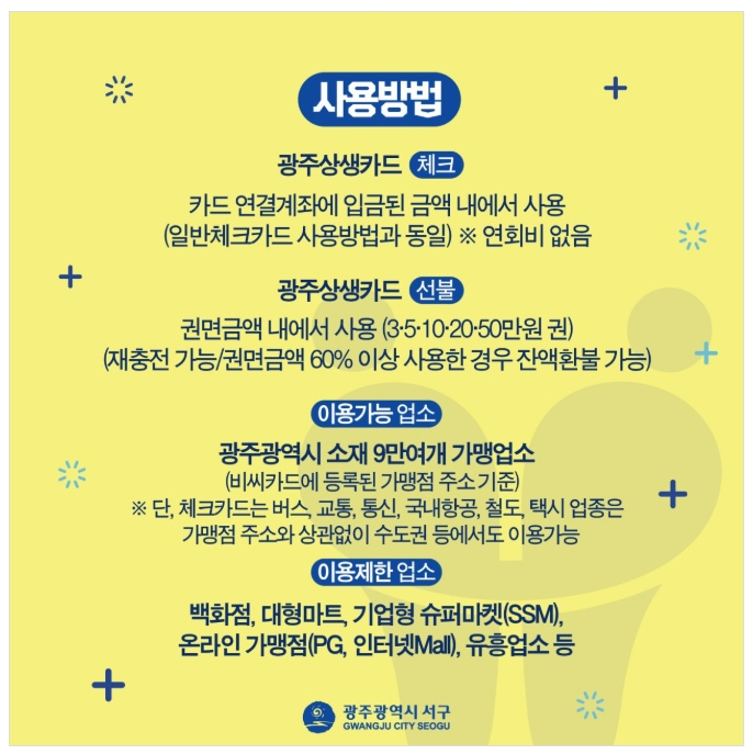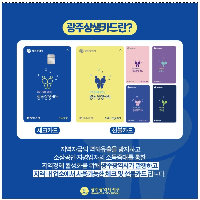 광주 상생카드란 지역경제 활성화를 위해 광주시에서 발행하고 있는 지역화폐입니다. 체크카드와 선불카드의 형식으로 광주광역시 소재 9만여 개의 가맹점에서 사용할 수 있습니다.