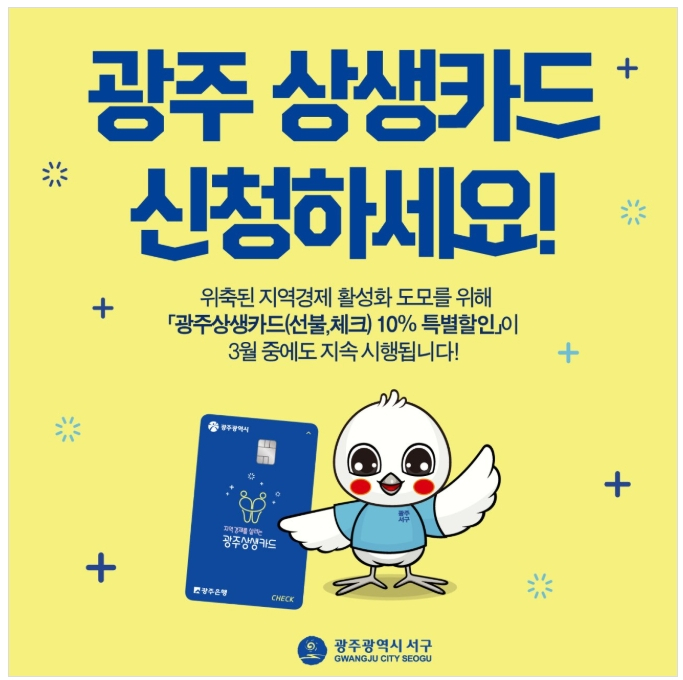광주은행에서 발급가능하며 1인당 매월 50만 원 한도액에서 사용액의 10%를 캐시백 해주는 이벤트가 진행 중입니다. (예산 소진 시까지 진행 예정)