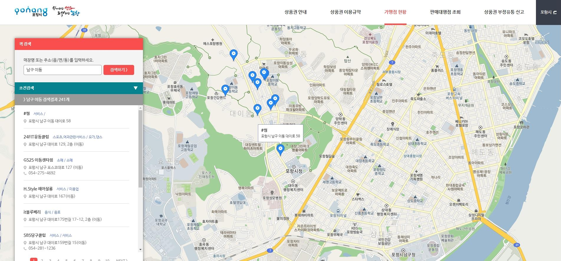 예로 포항시 남구 이동을 검색해 보면 총 241개의 가맹점이 존재하며, 가맹점 리스트와 함께 지도상에 위치정보도 같이 뜨게 됩니다.
