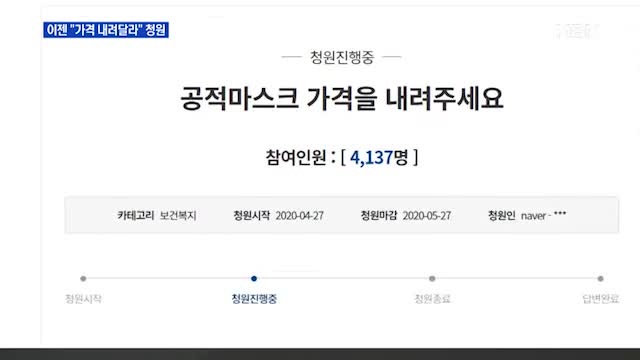 조달청에서는 가격 인하에 대한 요구가 있는 것도 잘 알고 있지만 현재 전국 140여 개 마스크 생산업체와 다음 달 6월 말까지 공적 마스크 제조·공급계약을 맺은 상태이며, 계약 기간 동안은 가격 인하가 어렵다고 합니다.