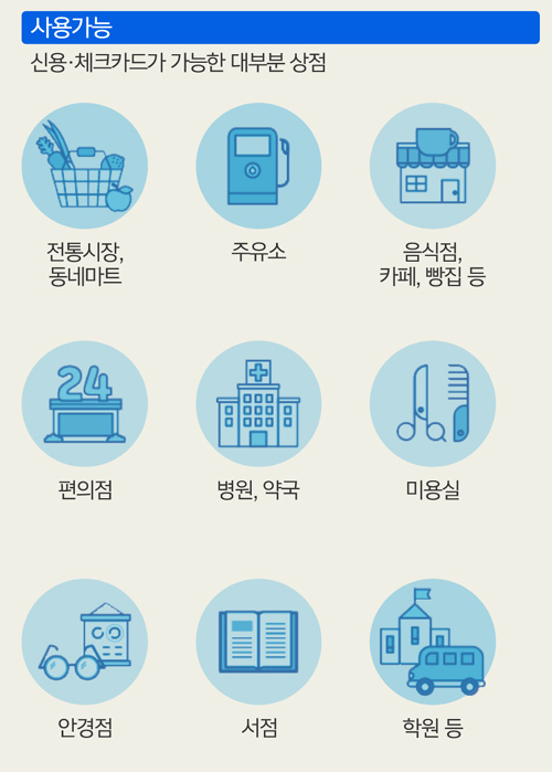 사용할 수 없는 곳은 대형마트, 백화점, 하이마트 같은 대형 전자판매점, 쿠팡 등 온라인 쇼핑몰, 유흥업소, 스포츠마사지 같은 위생업종, 노래방, 골프장 같은 레저업종, 카지노 같은 사행업종, 면세점, 보험과 세금 납부, 교통비, 통신료 납부 등입니다.