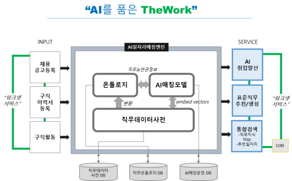 ‘더워크 에이아이'(The Work AI)는 고용노동부와 한국고용정보원이 운영하는 워크넷의 직무역량 중심 인공지능 일자리 연결 서비스입니다. 사용자의 이력서를 분석해 일자리를 추천해주던 기존 빅데이터 기반 서비스에서 한발 더 나아가 인공지능 기술을 통해 사용자에게 더 적합한 일자리를 추천해 주는 기능을 강화했습니다.