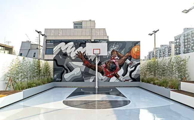 국내 아티스트 ‘알타임 조(Artime Joe)’의 ‘Jump On’으로 완성된 농구 코트가 세워져 있습니다. 해당 작품은 마이클 조던의 덩크 장면의 에너지를 강렬한 컬러와 기하학적인 도형으로 구현해서 색다른 느낌을 줄 것으로 예상됩니다.