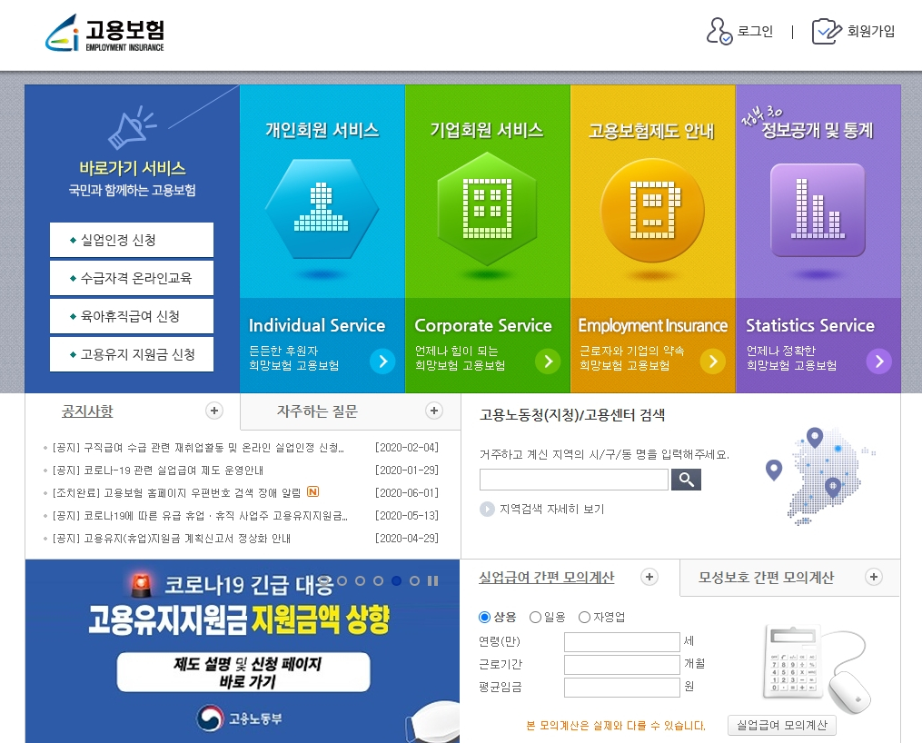 고용보험 홈페이지에서 실업급여 신청이 가능합니다. 일단 홈페이지 접속 후, 고용보험 가입 여부와 이직확인서 처리 여부를 조회해야 합니다. 이 두 가지(이직확인서와 고용보험 상실) 사항을 충족하면 서류상의 절차는 끝나며, 온라인 교육 및 구직 신청, 고용센터 방문 과정으로 진행하면 됩니다.
