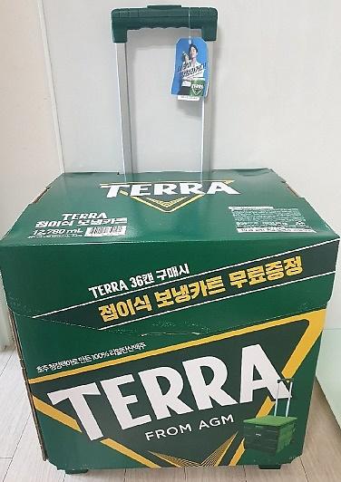 테라는 하이트진로에서 나오는 맥주 브랜드로 355ml 테라 캔 36개를 구매하면, 테라 접이식 보냉 카트를 무료로 증정하고 있습니다. 접이식 보냉 카트에는 28L 보냉백도 함께 증정되어 인기가 더욱 많다고 합니다.