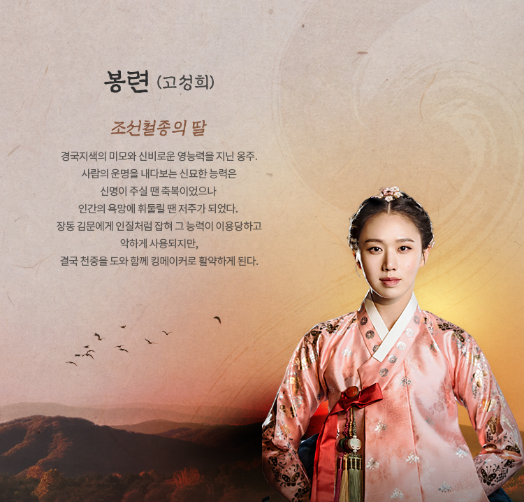 조선 철종의 딸이자 사람의 앞날을 내다보는 신비로운 능력을 가진 옹주 봉련 역에는 고성희 씨가 맡아 연기하였으며, 흥선대원군 역에는 전광렬 씨가 열연 중입니다.