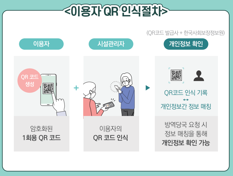 또한 QR코드 시스템은 감염병 위기경보 '심각' 및 '경계' 단계에서 한시적으로 운영되고, 수집된 정보는 4주가 지나면 자동 파기됩니다. 더하여 QR코드는 1회용으로 발급되며, 시설 입장 시 15초 동안만 효력이 유지됩니다.