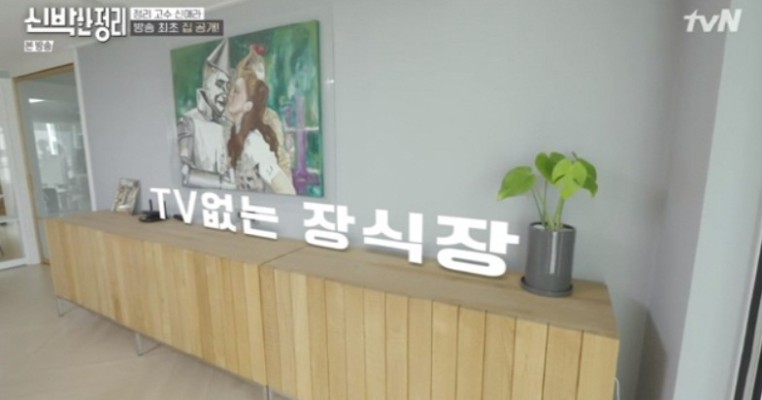 신애라 씨 아파트 거실에는 소파 대신 테이블과 의자가 있고, 장식장에는 tv가 없습니다. 책도 간직하고 싶은 것만 빼놓고는 모두 정리한 상태이며, 심지어 트로피도 2개만 보관되어 있어 '정리의 여왕'의 진 모습을 보여주었습니다.