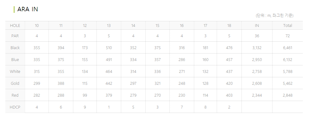 코스는 아라 코스(OUT, IN), 미르코스(OUT, IN) 등 4개 코스로 구성되어 있으며, 아라코스 또는 미르 코스의 지정은 가능하나, 아라 코스와 미르 코스를 혼용한 코스의 지정은 불가능합니다.