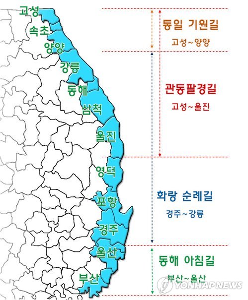 2016년 5월 완전히 개통한 해파랑길은 동해아침(1~4코스), 화랑순례(5~18코스), 관동팔경(19~40코스), 통일 기원(41~50코스)으로 구성돼어 있으며, 부산, 울산, 경주, 포항, 영덕,울진, 삼척, 동해, 강릉, 양양, 속초, 고성 등을 거칩니다.