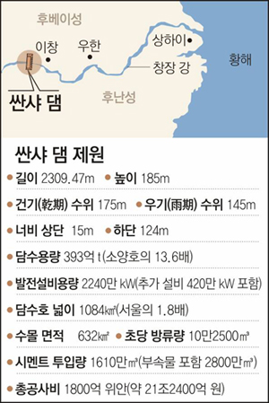 2006년 여름에 완성된 싼샤댐은 세계 최대의 댐으로 높이 185m, 길이 2309m, 너비 135m를 자랑하며, 최대 저수량은 390억t, 최고 수위는 175m에 이릅니다. 총 시설용량은 1820만㎾, 연간 발전량은 847억㎾으로 세계 최대 용량의 에너지를 발전합니다.