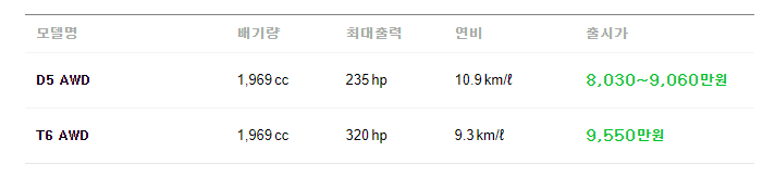 2020 볼보 XC90 기준으로 가격 및 성능은 다음과 같습니다.