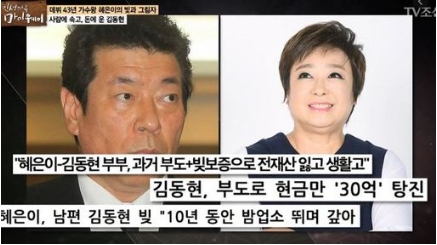 이 당시 김동현 씨는 초혼이라 김동현 씨 집안에서 반대가 심했지만, 1990년 두 사람은 결혼에 골인하게 됩니다. 그러나 그 후 김동현 씨의 계속되는 사업실패와 보증, 빚, 사기 등의 문제로 혜은이 씨까지 고생을 한 후 2019년 두 사람은 30년 결혼생활의 종지부를 찍고 이혼하게 됩니다.
