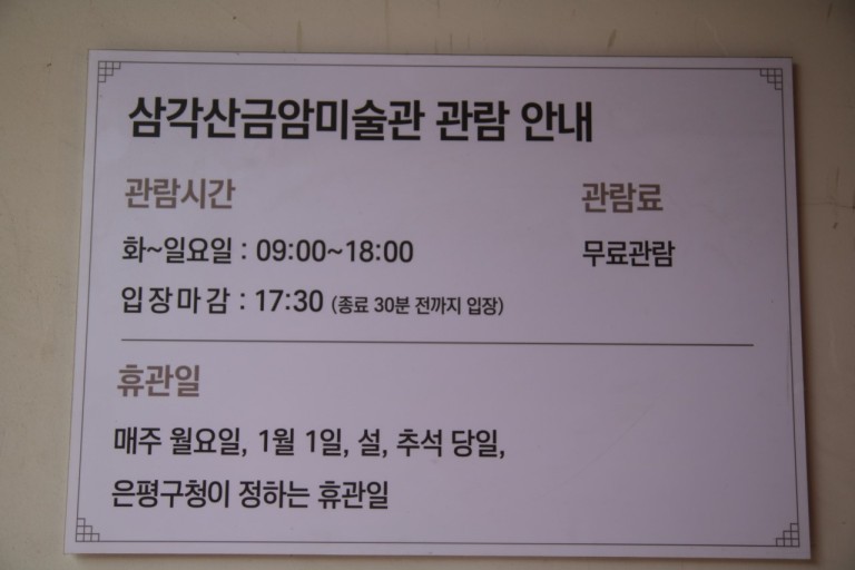 삼각산 금암 미술관은 한옥구조로 되어 있는 미술관으로 2018년 개관했습니다. ‘셋이서 문학관’ 바로 옆에 위치하고 있으며, 두 건물 사이에는 쪽문이 있어 방문객들이 쉽게 드나들 수 있도록 했습니다.