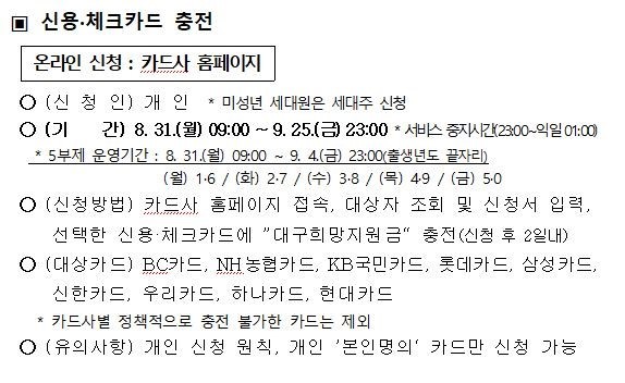7월 31일부터 충전을 희망하는 카드의 카드사 홈페이지에서 충전 신청을 할 수 있습니다. 단, 온라인 신청이 어려운 사람들은 다음 달 7일부터 각 카드사와 연계된 은행 영업점에서 신청이 가능합니다.