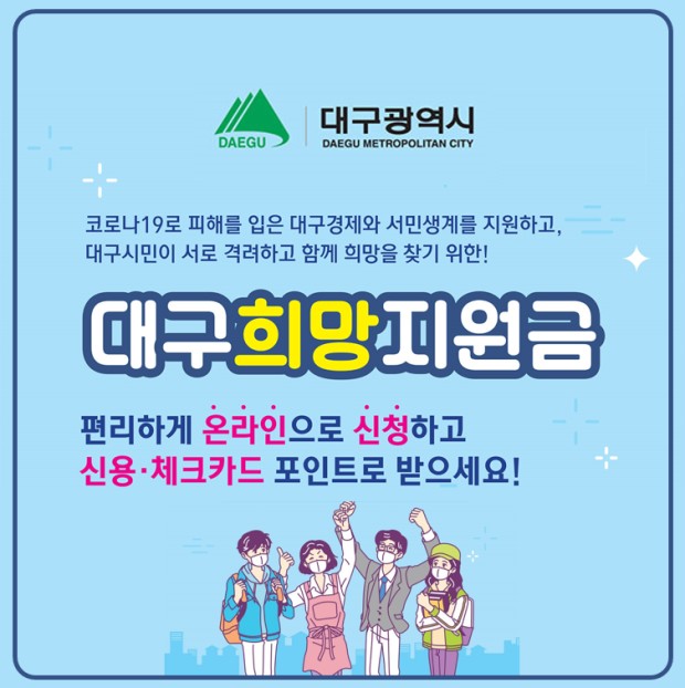 코로나 19 재확산으로 2차 재난지원금에 대한 이야기가 나오고 있는 가운데, 대구시에서 대구 시민에게 1인당 10만 원씩 지급하는 '대구희망지원금'이 8월 24일부터 지급되고 있습니다.