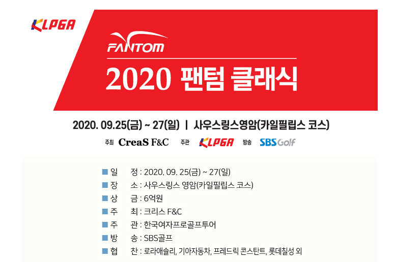 2020 팬텀 클래식 대회는 KLPGA가 상금을 지원하며, 골프의류 업체 크리스 F&C가 대회 운영비를 지원하는 방식으로 열립니다. 대회 명칭으로 들어간 ‘팬텀’은 크리스 F&C 골프의류 브랜드 가운데 하나로 알려져 있습니다.