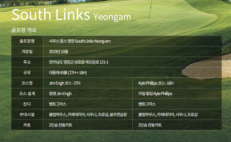 사우스 링스 영암은 영암호 일대 매립지에 조성된 골프 코스로, 스코틀랜드의 링스 코스를 새롭게 재해석하여 만든 코스로 유명합니다. 세계적인 골프 코스 설계가 두 사람이 설계했으며, 그 이름을 따서 짐앵 코스, 카일필립스 코스 이렇게 두 개의 개성 있는 코스가 있습니다. 자연친화적인 골프장이 모토이며, 원형지의 특성을 코스 설계에 반영해, 생태 습지, 토착 수종, 수로, 철새 등을 만나볼 수 있습니다.