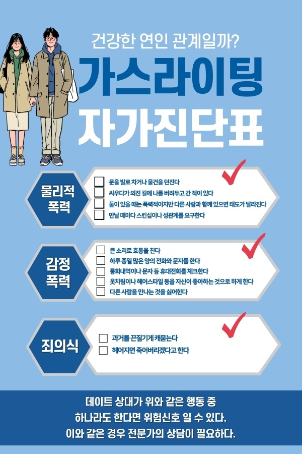 여기서 더 나아가면, “너는 나 아니면 아무도 만날 수 없을 거야”, “네 주변 사람들은 나에 대해 안 좋은 소리만 하니까 누구의 말도 믿지 마”, "왜 날 자꾸 자극하는 거야?”, “그러니까 날 화나게 만들지 말랬잖아!” 등의 데이트 폭력까지 행해질 수 있습니다.