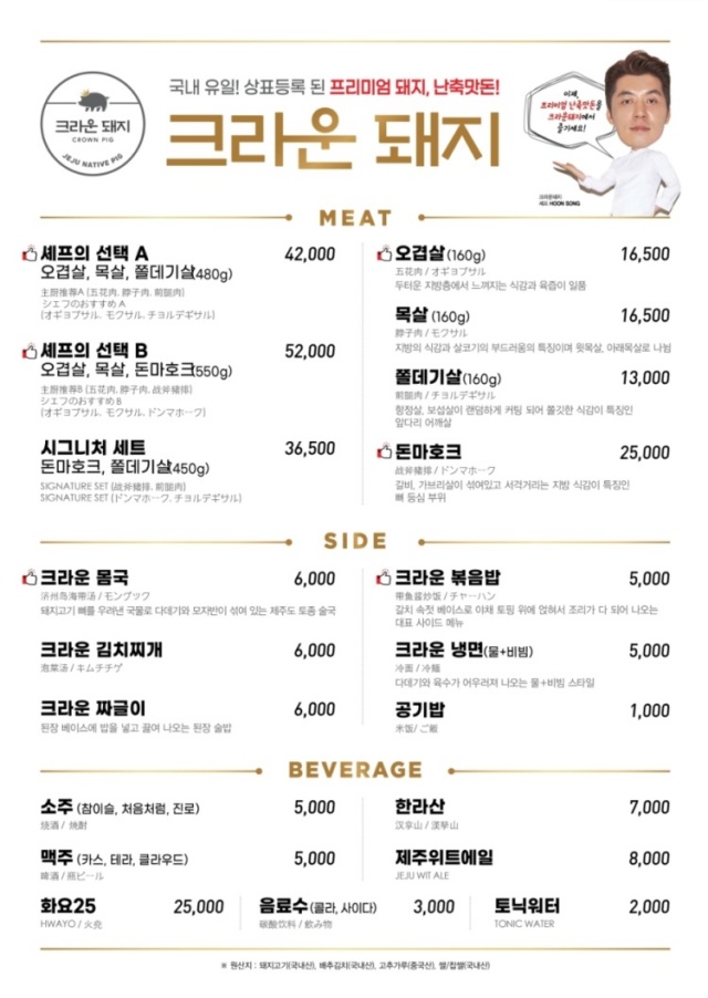 제주도에 위치한 송훈랜드에 오픈한 두 개의 가게 중 하나가 바로 흑돼지집 '크라운돼지'입니다. 베이커리 카페 바로 맞은편에 위치한 크라운돼지는 서울 강남 신사동에도 매장이 있으며, 제주도가 제2호 매장입니다.